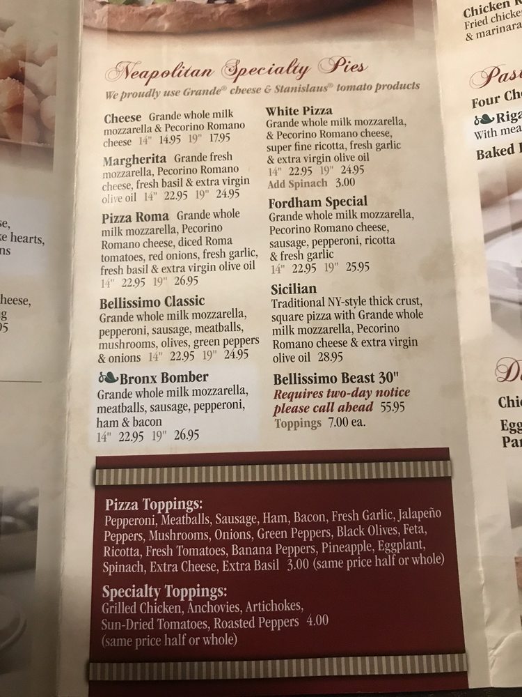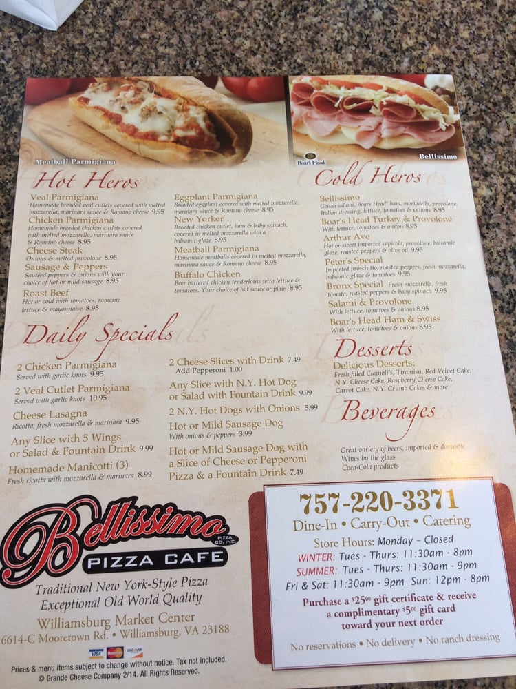 Bellissimo Pizza Cafe, located in Williamsburg, VA, is a must-visit for pizza lovers. With a variety of specialty pizzas in both 19' and 14' sizes, including unique options like the Pickle Pizza and Nashville Hot Chicken, this cafe offers a taste of New York right in Virginia. Customers rave about the freshness of the ingredients, the New York-style crust, and the friendly service. The menu also includes add-ons like red pepper flakes and parmesan cheese to customize your pizza experience. Whether you're craving a classic Margherita pie or a bold Buffalo Chicken pizza, Bellissimo Pizza Cafe has something for everyone. Don't miss out on the opportunity to try some of the best pizza in Williamsburg at Bellissimo Pizza Cafe.